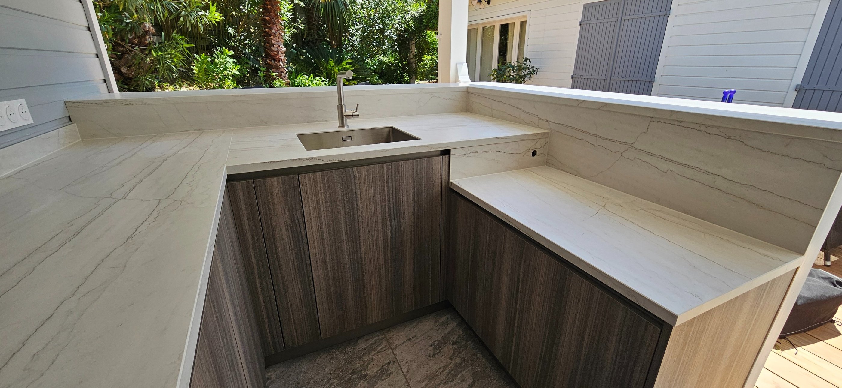 Effet Naturel: En prolongeant le motif principal jusqu'aux bords, les retombées créent un effet plus naturel, donnant l'impression que le plan de travail est taillé dans un seul bloc.